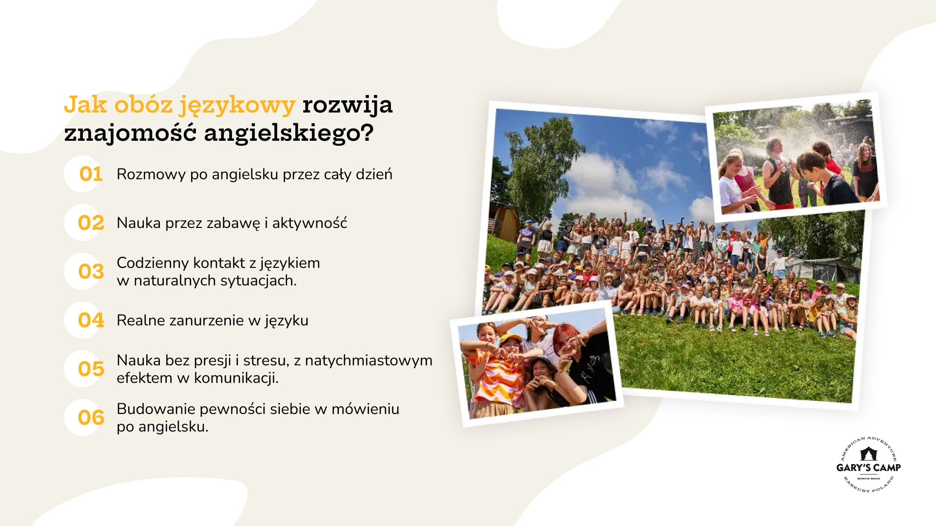 - wyjazd na obóz językowy i nauka przez doświadczenie – nic tak nie rozwija znajomości języka angielskiego, jak pełne zanurzenie w nim. Właśnie to oferują obozy Gary’s Camp. Zamiast siedzieć nad podręcznikiem, uczestnicy spędzają czas w naturalnym środowisku językowym: rozmawiają z native speakerami, biorą udział w grach terenowych, warsztatach i codziennych aktywnościach po angielsku.